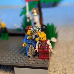 Finally, we have Pythio the oracle. They are non-binary, and ultra fabulous, which was a little tricky given my lego collection. I don't think the dragon ninja/Frozen ensemble will make the cut for the actual show costume, but I decided it was acceptable for my photo shoot. Pythio's prophecies really get the plot going, and the King's servant Dametas (also pictured) often seems to be the only one who paid them any attention. There's some fun had with flags in the script, hence the pennants Pythio is holding. Dametas gets a surprise ending in exchange for trying to keep the flags and prophecy in mind, but I won't give it away here.
